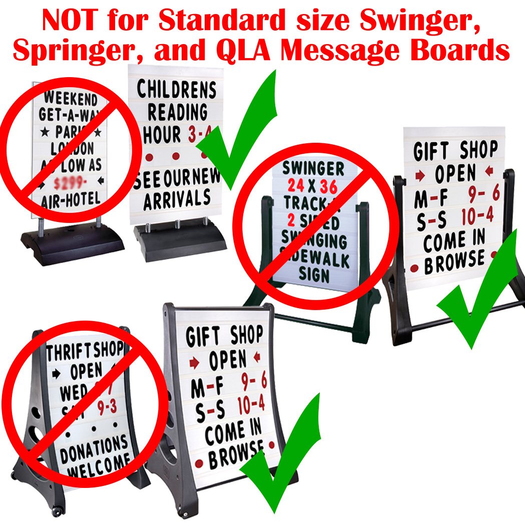 If your sign is not a roadside or extra large size A-frame, Swinger, Springer, Tip-N-Roll, or QLA Message Board, be sure to measure your sign or existing letters. Not intended for standard size sidewalk signs – use 4 inch letter sets for these signs types.