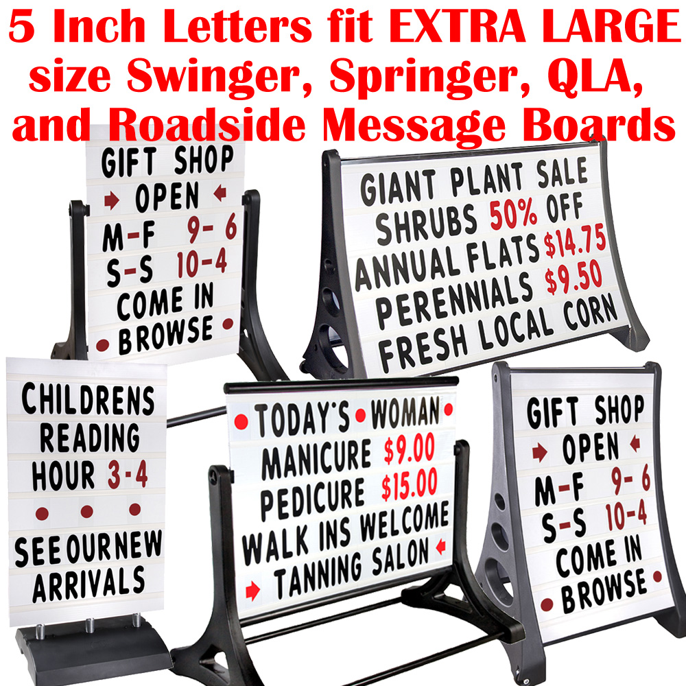 Designed for oversize and extra large SmartSign, Magic Master, Signicade, Excello, and other A-frame message board signs, letter sets will work on any sign that accepts 5 inch tall letters.